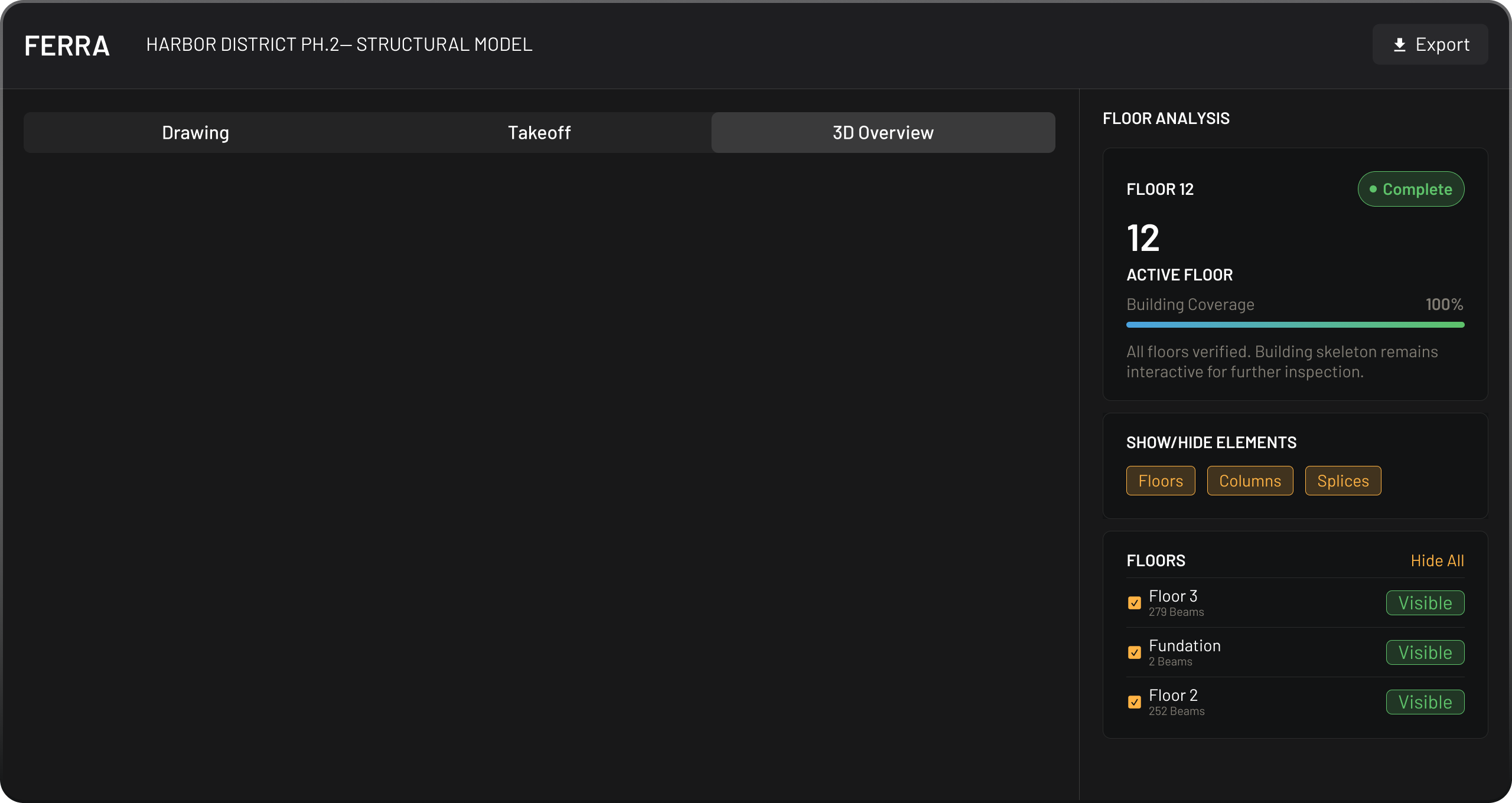 Ferra converts structured takeoffs into interactive 3D models so you can validate scope and prepare for downstream workflows.
