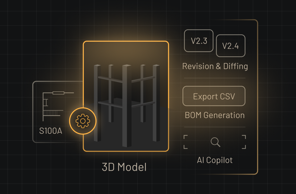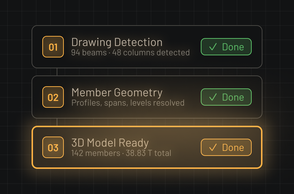 Takeoff data flows directly into 3D geometry. No manual modeling — structural members placed from detected scope.