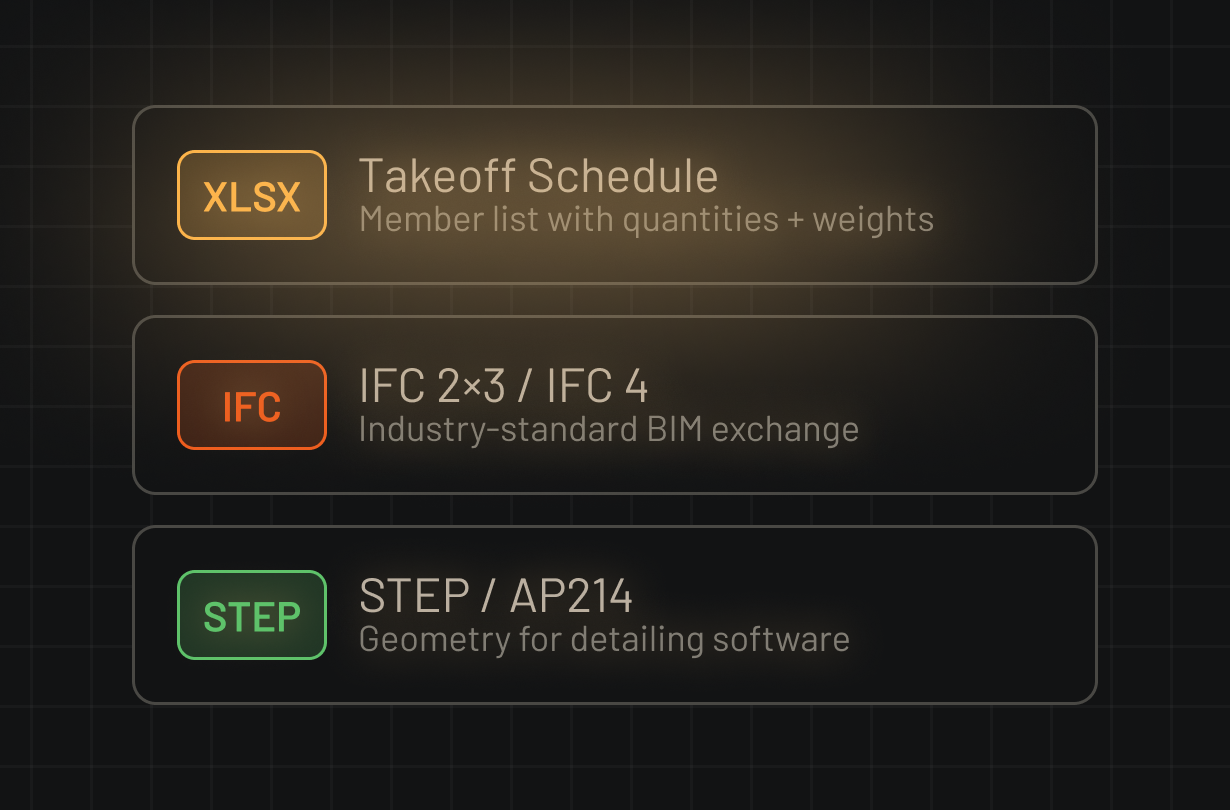 IFC, STEP, and takeoff schedule exports ready for coordination, detailing, and downstream review workflows.