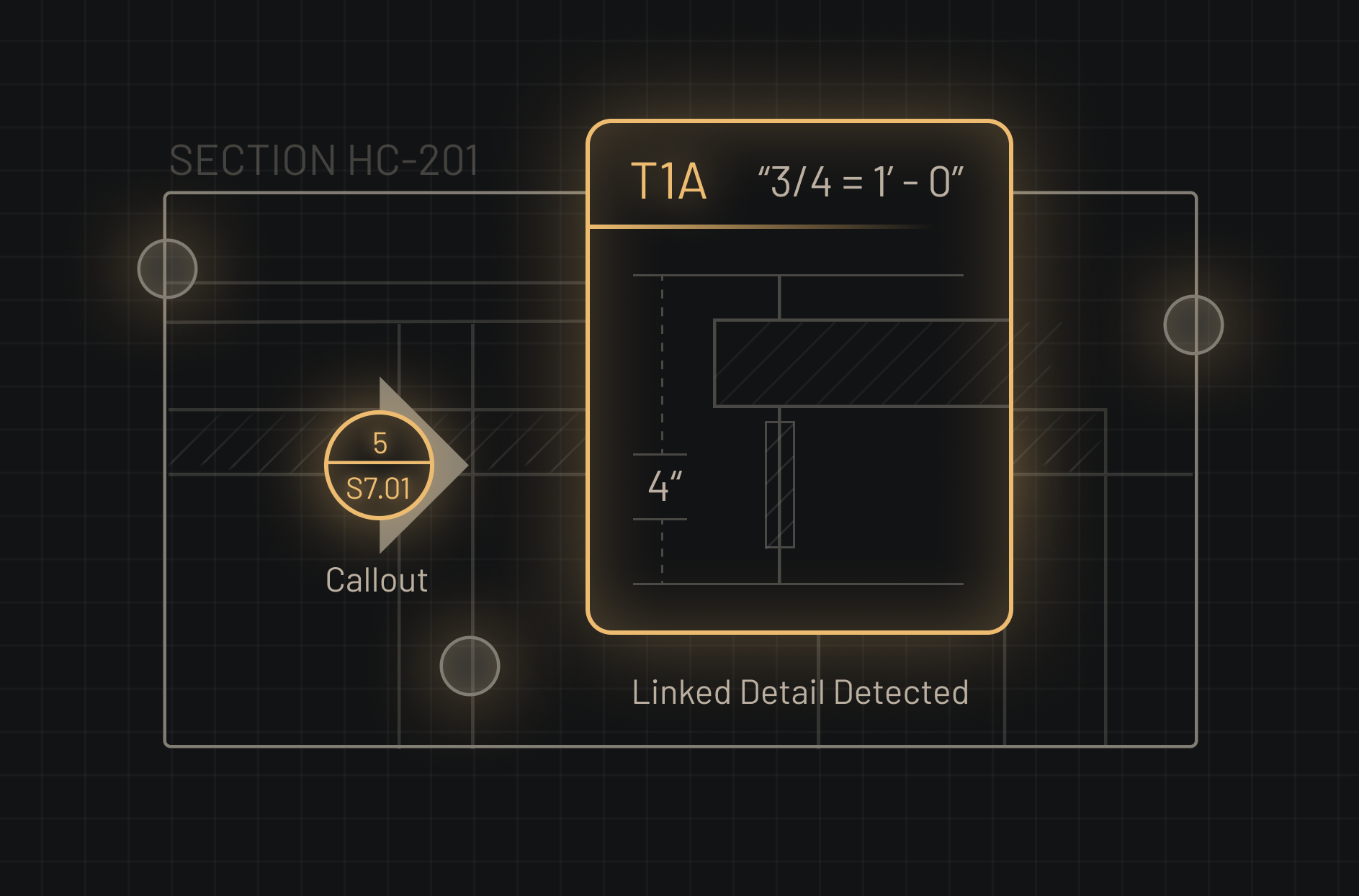 Upload your drawings. Ferra detects structural elements across all sheets, connects related views, and builds a complete, navigable takeoff.