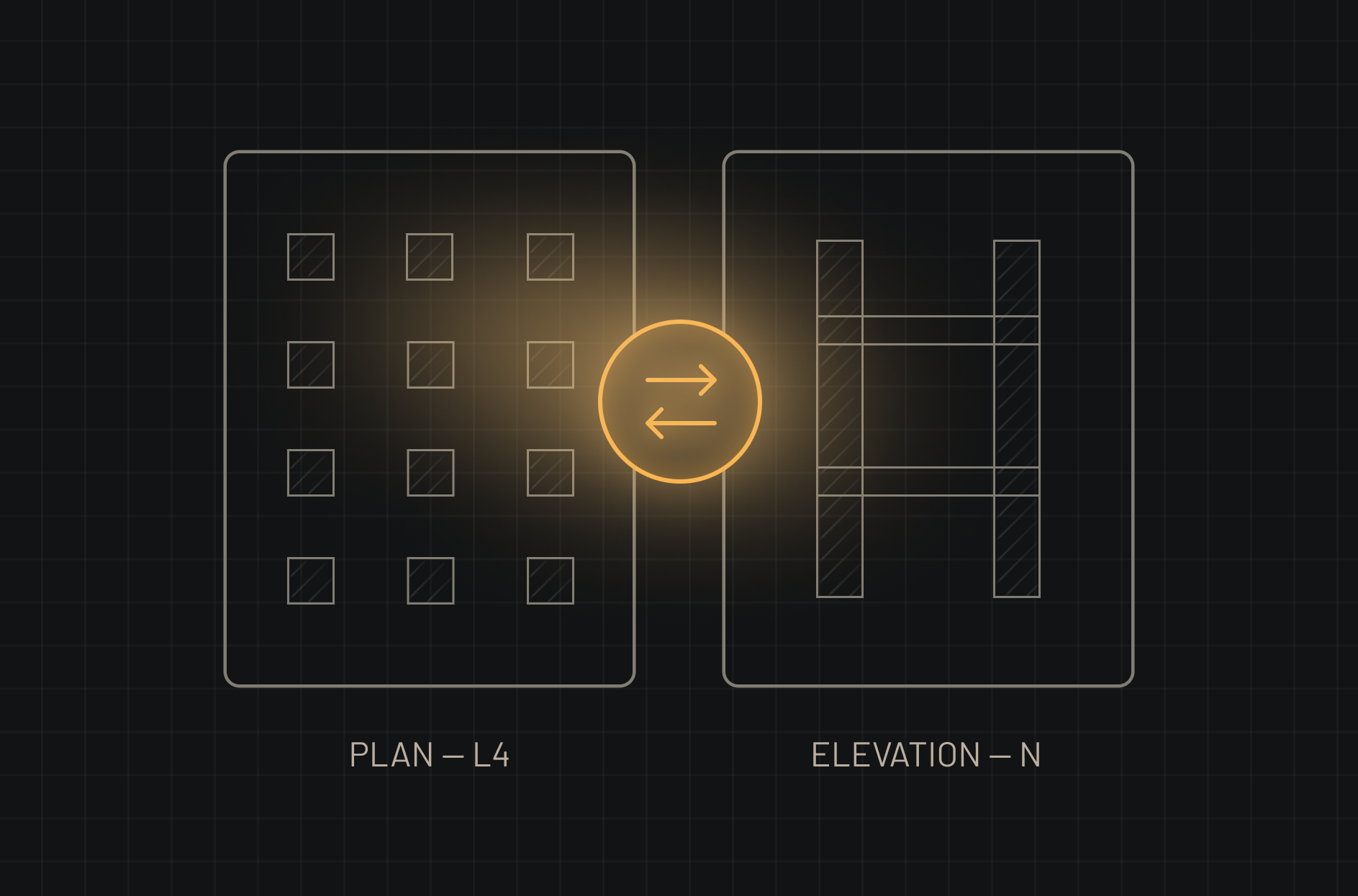 Plan view and elevation linked automatically. Column height resolved without manual cross-referencing.