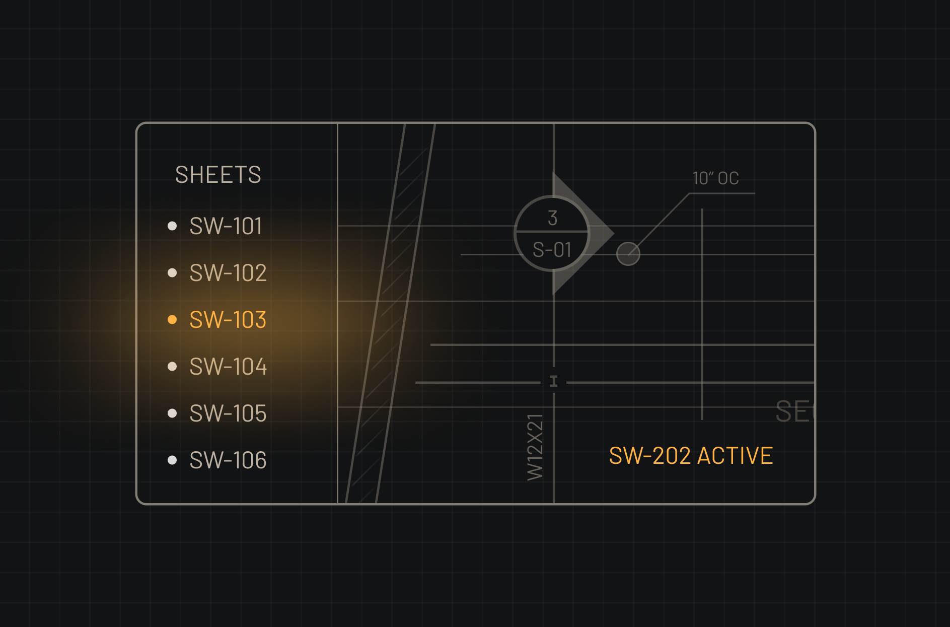 All the sheets organized into a single navigable system. Switch between sheets without losing context or element tracking.